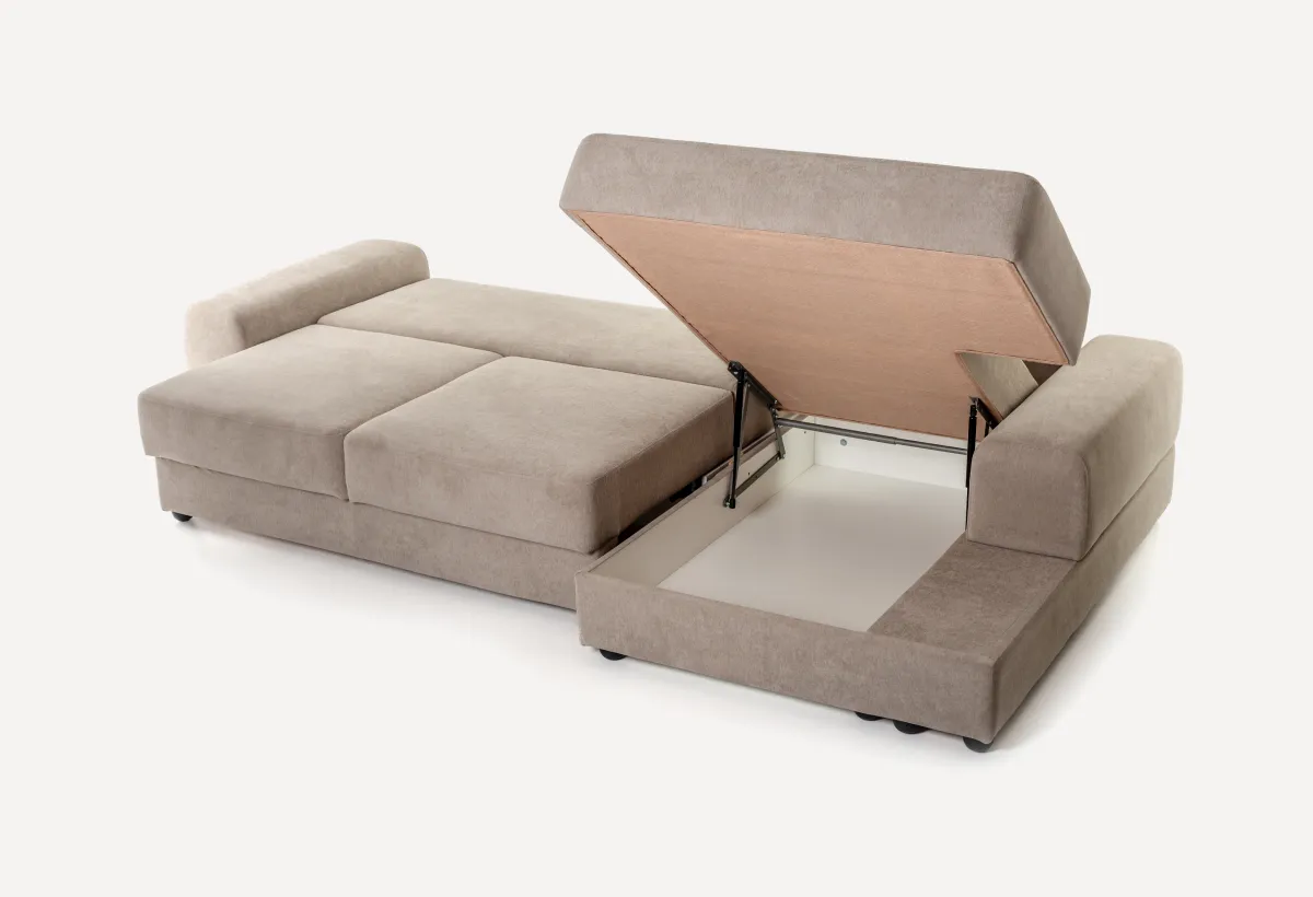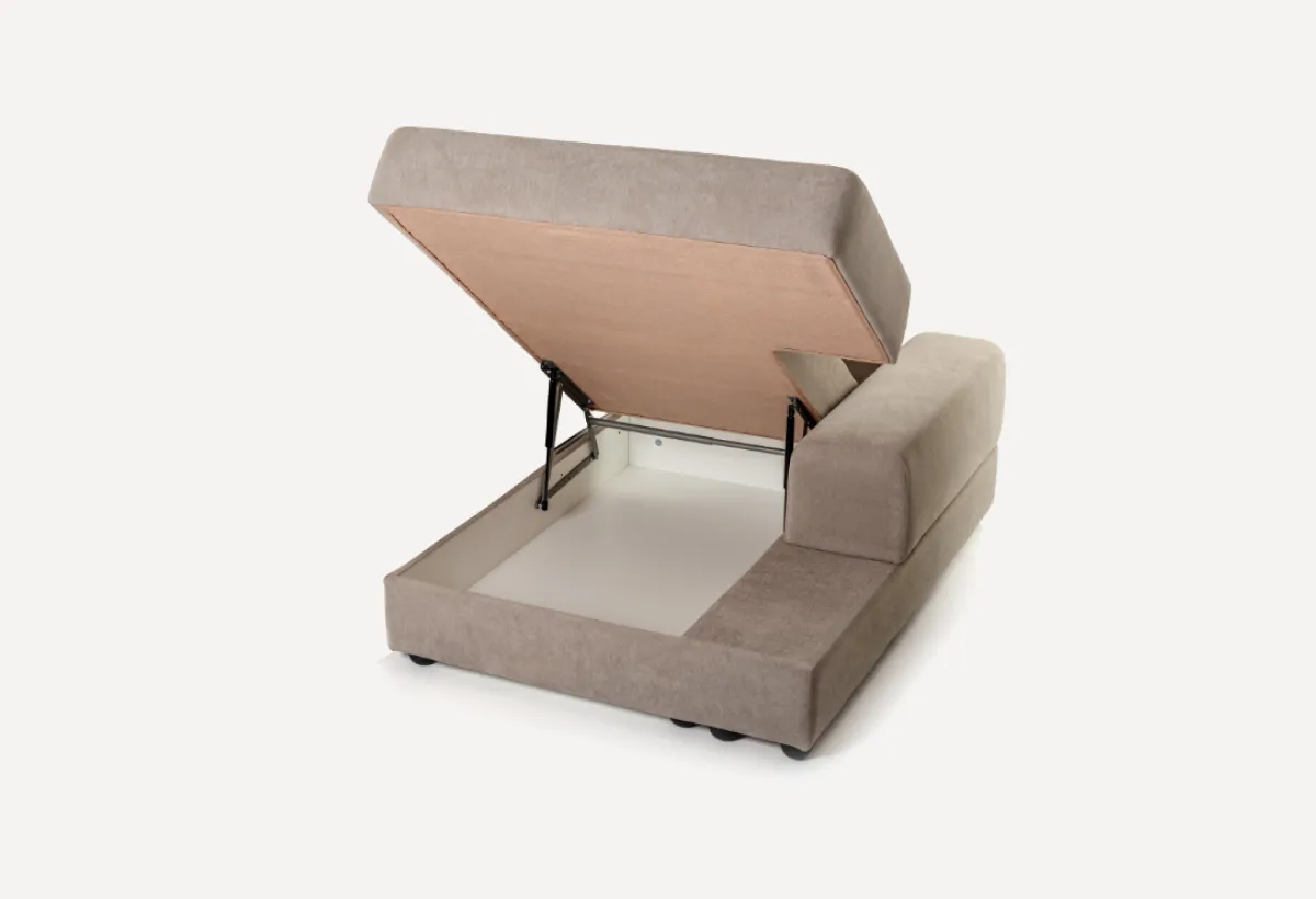 Это такой квадратный модуль без спинки. Тоже есть подъемный механизм и короб для белья. Ставится обычно с краю, чтобы делать диван Г-образным или П-образным. На ней удобно лежать или сидеть, подложив подушку. Кстати, ящик внутри — полноценный.