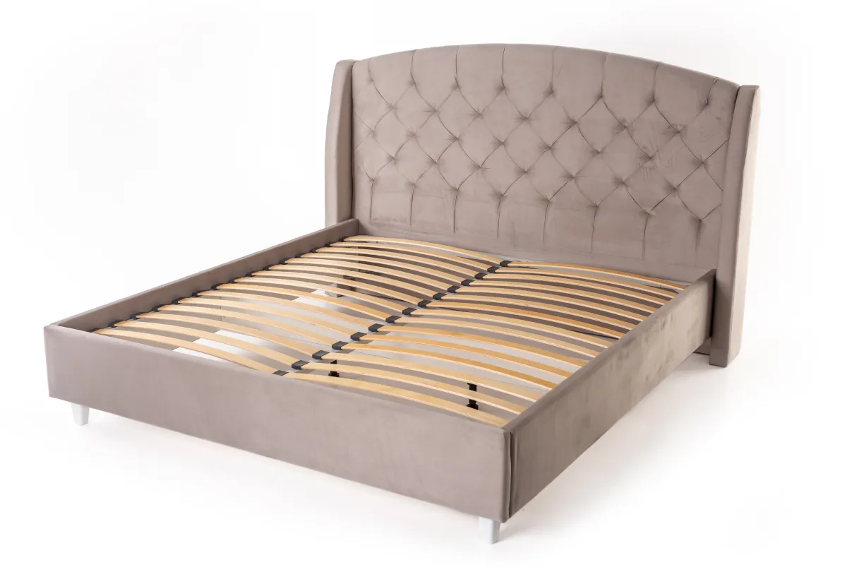 Классика и современность в одном изделииКровать имеет классический стиль в округлой формой и каретной стяжкой. Она оснащена высоким изголовьем с мягкой обивкой и декоративными пуговицами, что придает ей роскошный вид. Ножки кровати выполнены из прочного пластика, что добавляет современный штрих к общему внешнему виду. Общая форма кровати прямоугольная с аккуратными линиями, что подчеркивает её современный и функциональный дизайн.