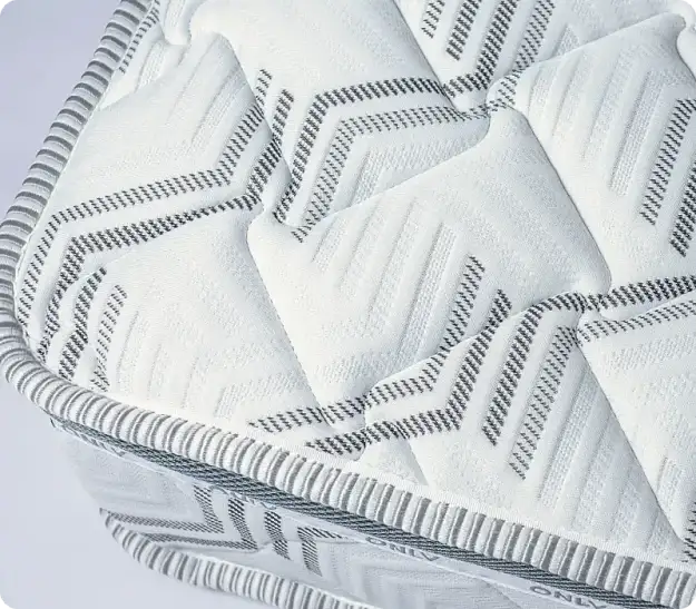 Элегантный комфортный видМатрас имеет белый верхний слой с черными и серыми геометрическими узорами, создающими контрастный дизайн. Темная серая полоса, идущая вдоль бока матраса, имеет текстурированный узор, который добавляет визуальный интерес и контраст к общему дизайну. Эта полоса, по-видимому, служит декоративным элементом, выделяя границу матраса и добавляя элегантности его внешнему виду. Она также может выполнять функциональную роль, помогая защитить края матраса от износа или повреждений. А также фирменная белая полоска с логотипом
